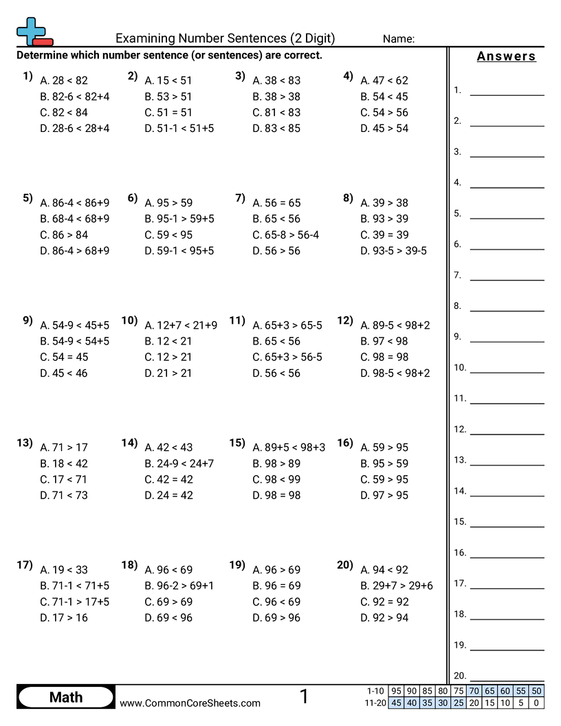 Free math worksheets on Examining Number Sentences (2 Digit) . Each worksheet has 20 problems with an answer key and are ideal for teachers and homeschooling. You can download the PDF, create a set of flash cards or set it up for online learning.