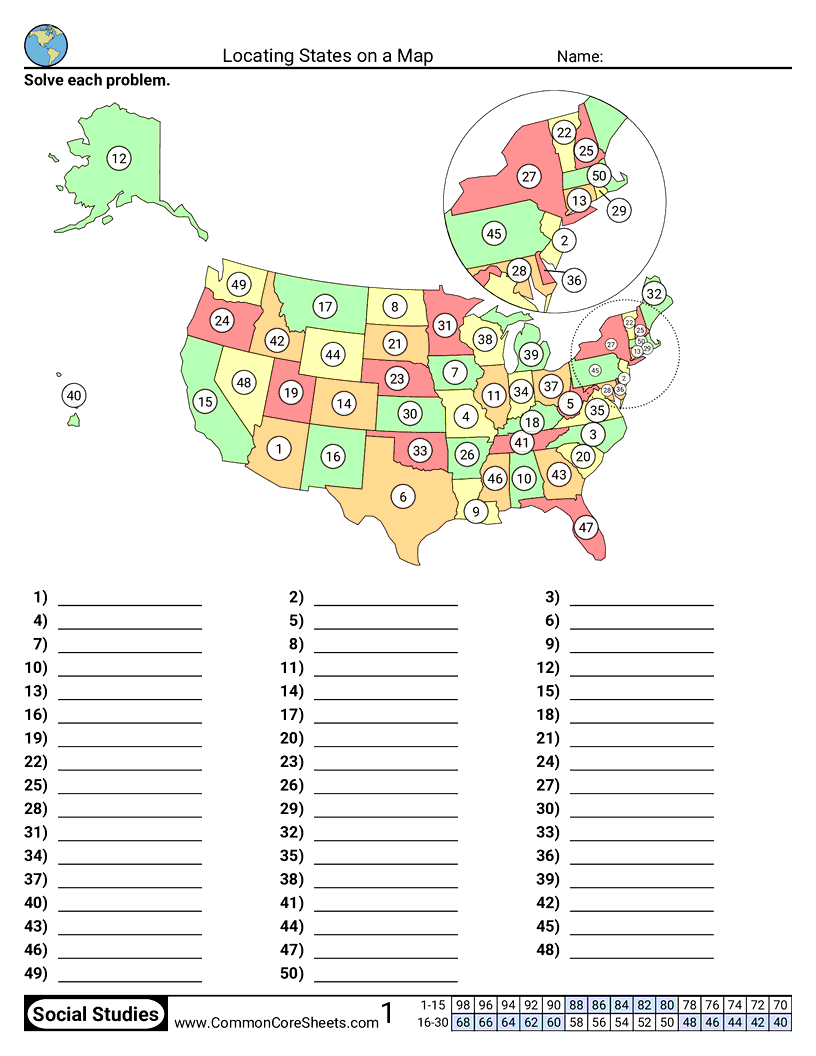 Each worksheet has 50 problems determining the location of a state.