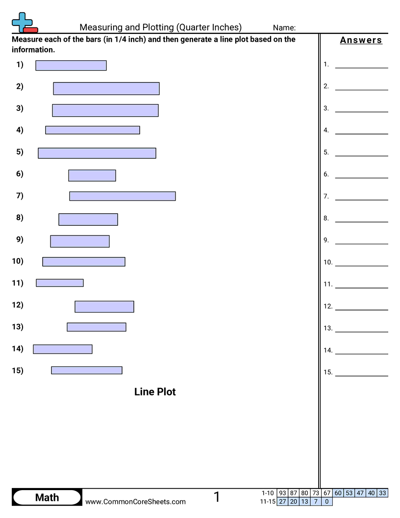 Each worksheet has 15 problems measuring bars and creating a line plot based on the information.